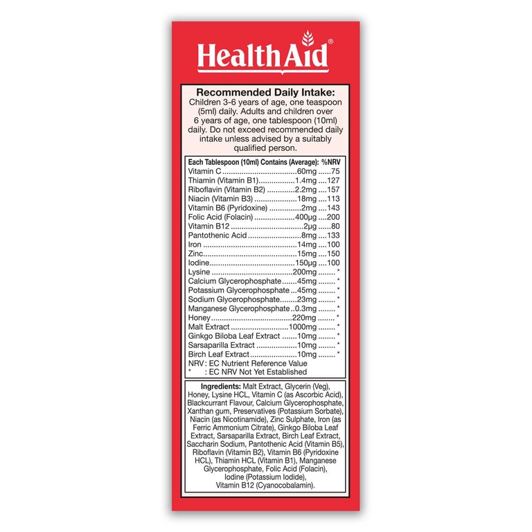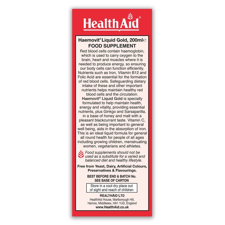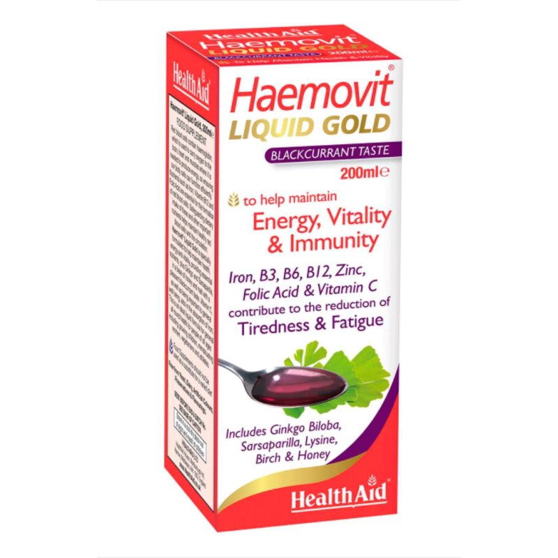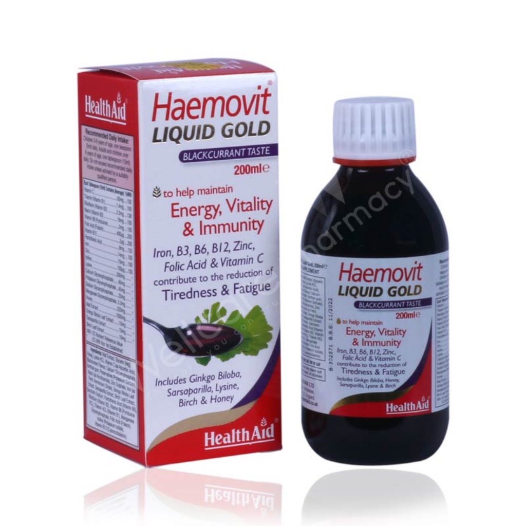 – Haemovit Liquid Gold là một công thức độc đáo cung cấp lượng tối ưu các Vitamin B, Sắt, Kẽm và các chất chiết xuất từ thảo dược bao gồm Ginkgo biloba, Sarsaparilla và Birch leaf. Công thức này được pha trộn cẩn thận với Mật ong và Mạch nha tự nhiên (giàu Vitamin B2, B3, B6, Kẽm, Phốt pho, Sắt, Magie & Canxi) cùng với các thành phần khác tạo nên hương vị tuyệt vời và bổ sung chất lỏng thúc đẩy sức khỏe. Công thức này sẽ giúp giải phóng năng lượng từ thức ăn, hình thành hemoglobin cho các tế bào hồng cầu, sử dụng oxy đến não, cơ tim và các mô và làm việc với cơ thể của bạn tràn đầy năng lượng.